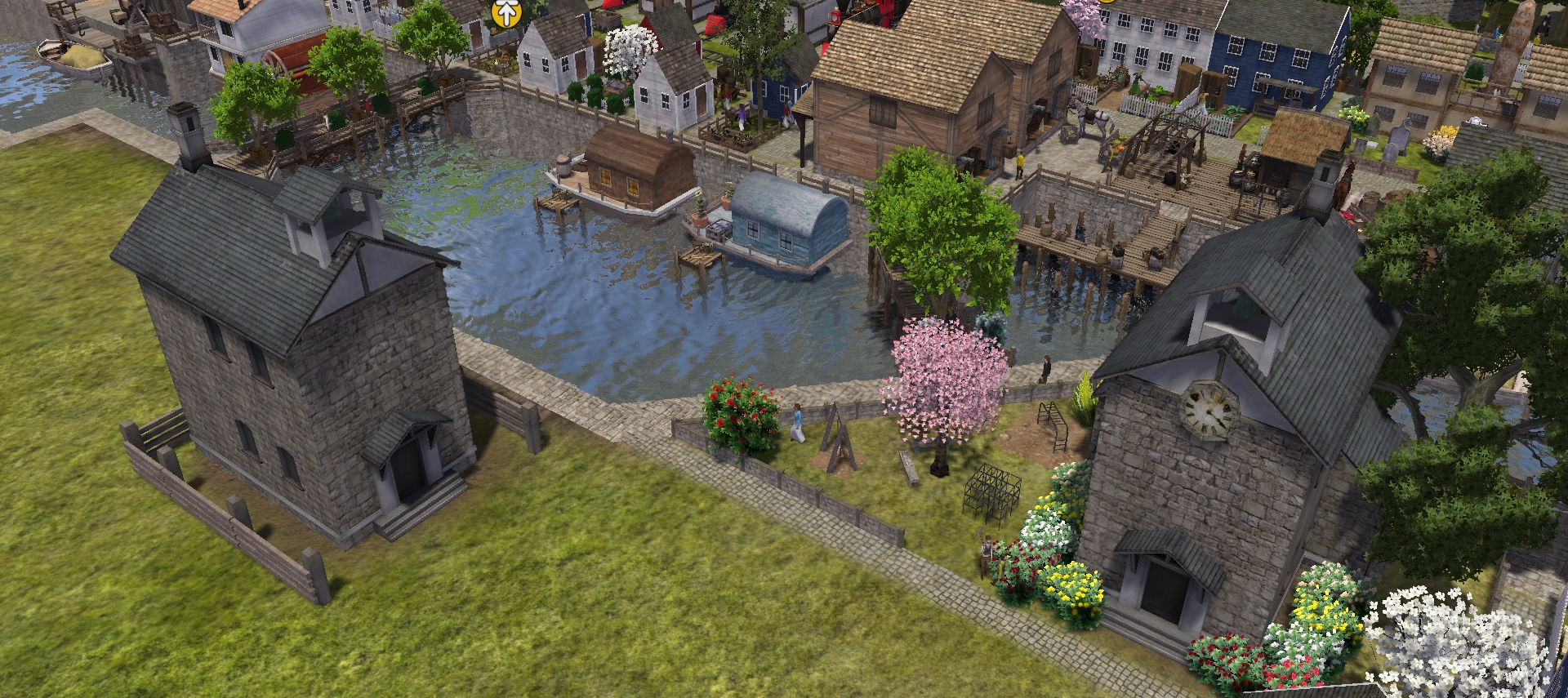 Big Market building, smith on the left with ressource yard in front of it. Little garden to relax with well in the middle. Greenhouse for seedlings and oil press. House boats with fishing spot in the very front.