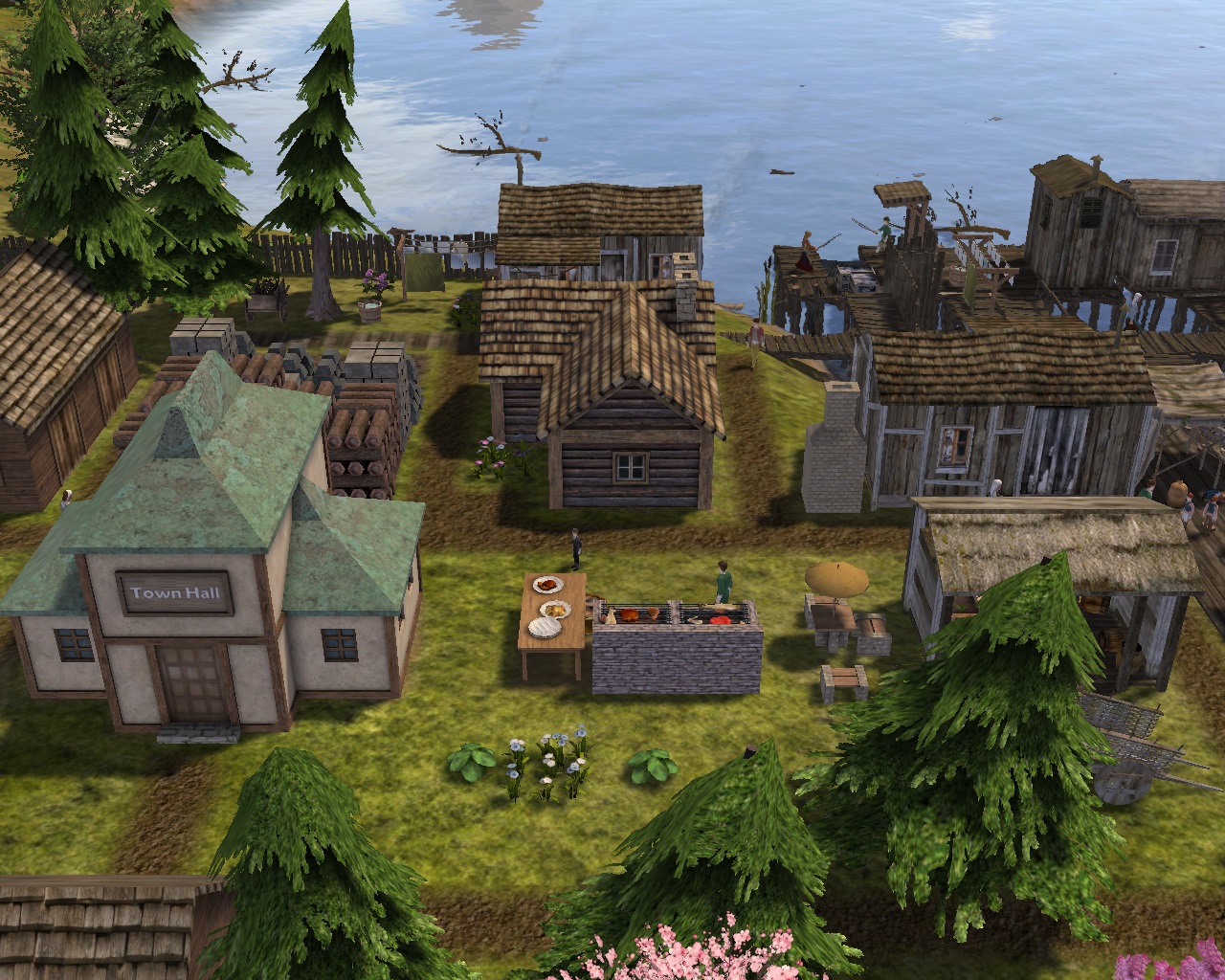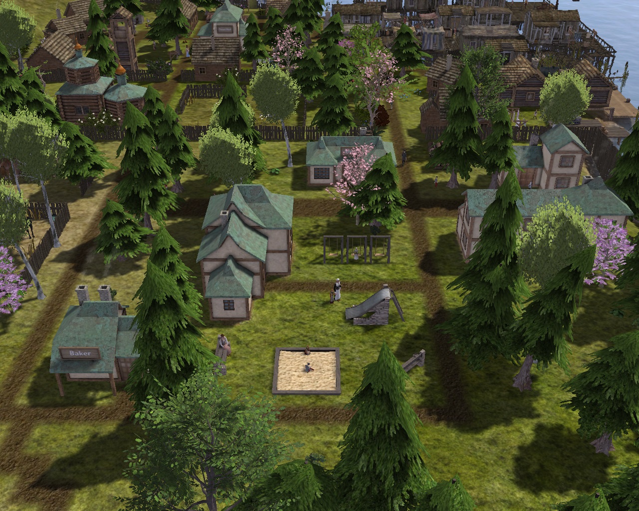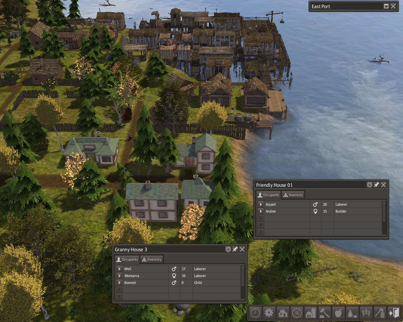 A couple with 2 adult children built a dock house between the reed farm and the overseer.  An adult daughter wanted a small forest house across from the BBQ; she did not know how to cook.  Her parents and brother built a neighborhood house in line with the other 2 on the road not far from where the shipwreck was.  At the end of that road by the shore, a lighthouse was built.
