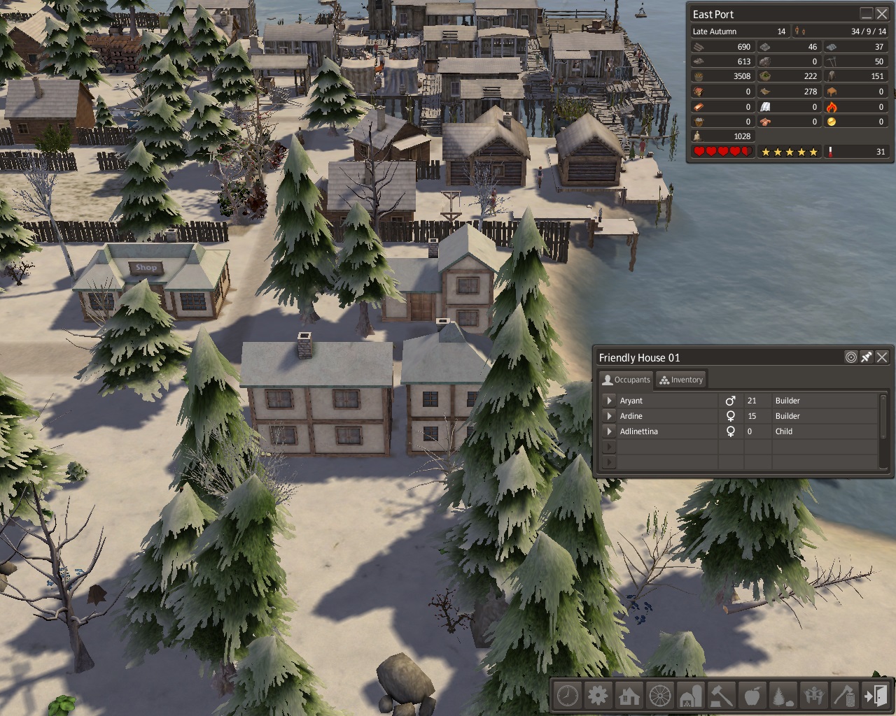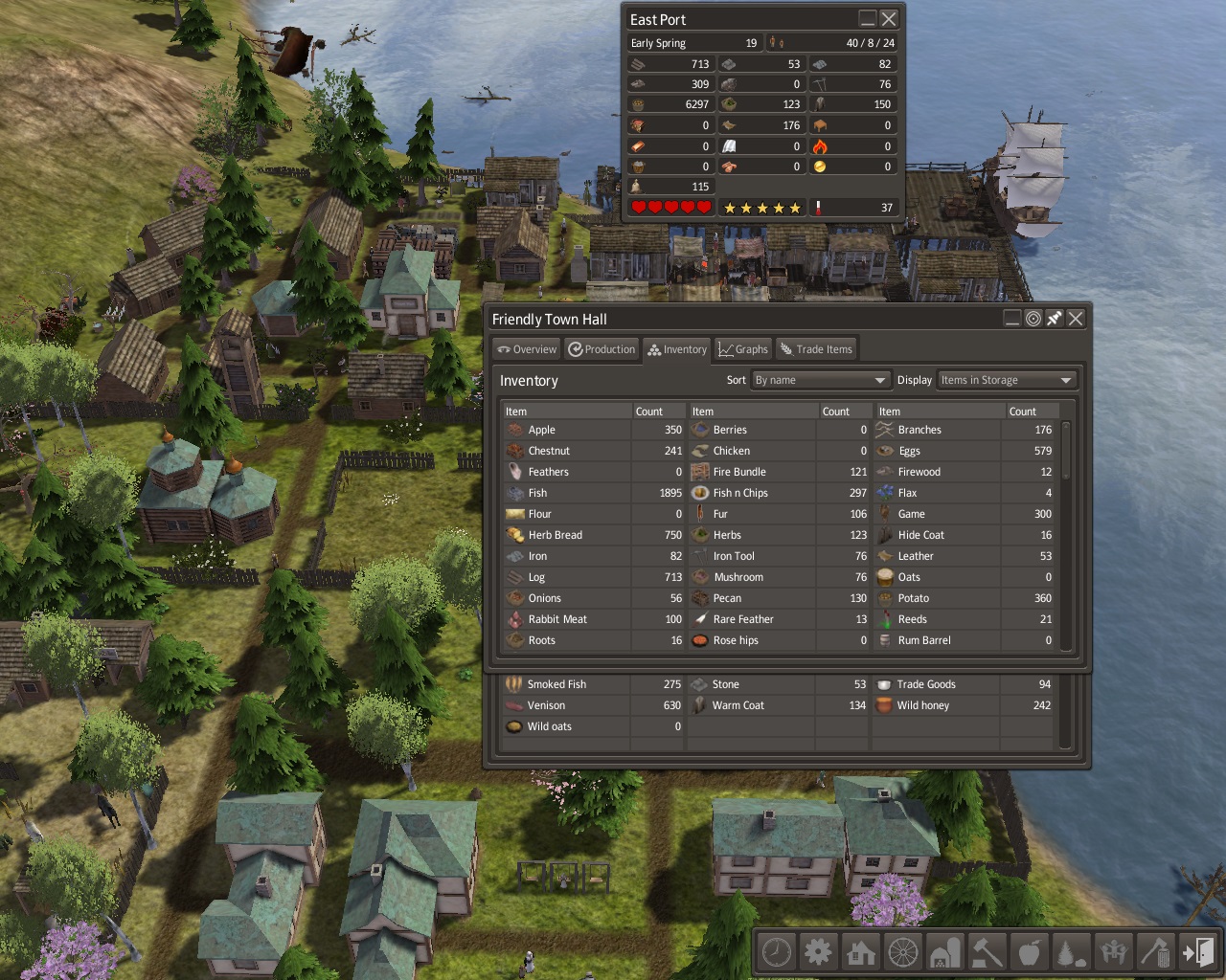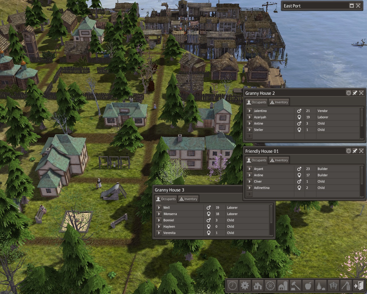 The Town Hall was built by the storage barn and stockpile.  By spring of year 15, a lot of information was already recorded.  The population of East Port was 57, 36 adults, 7 students, and 14 young children.  There were 22 families living in 16 homes.  There were 4 dock houses, 2 shanties, 2 forest houses, 4 workplace houses, 1 stable house, and 3 neighborhood houses.  There were young adults still living at home who would soon want homes and families of their own.