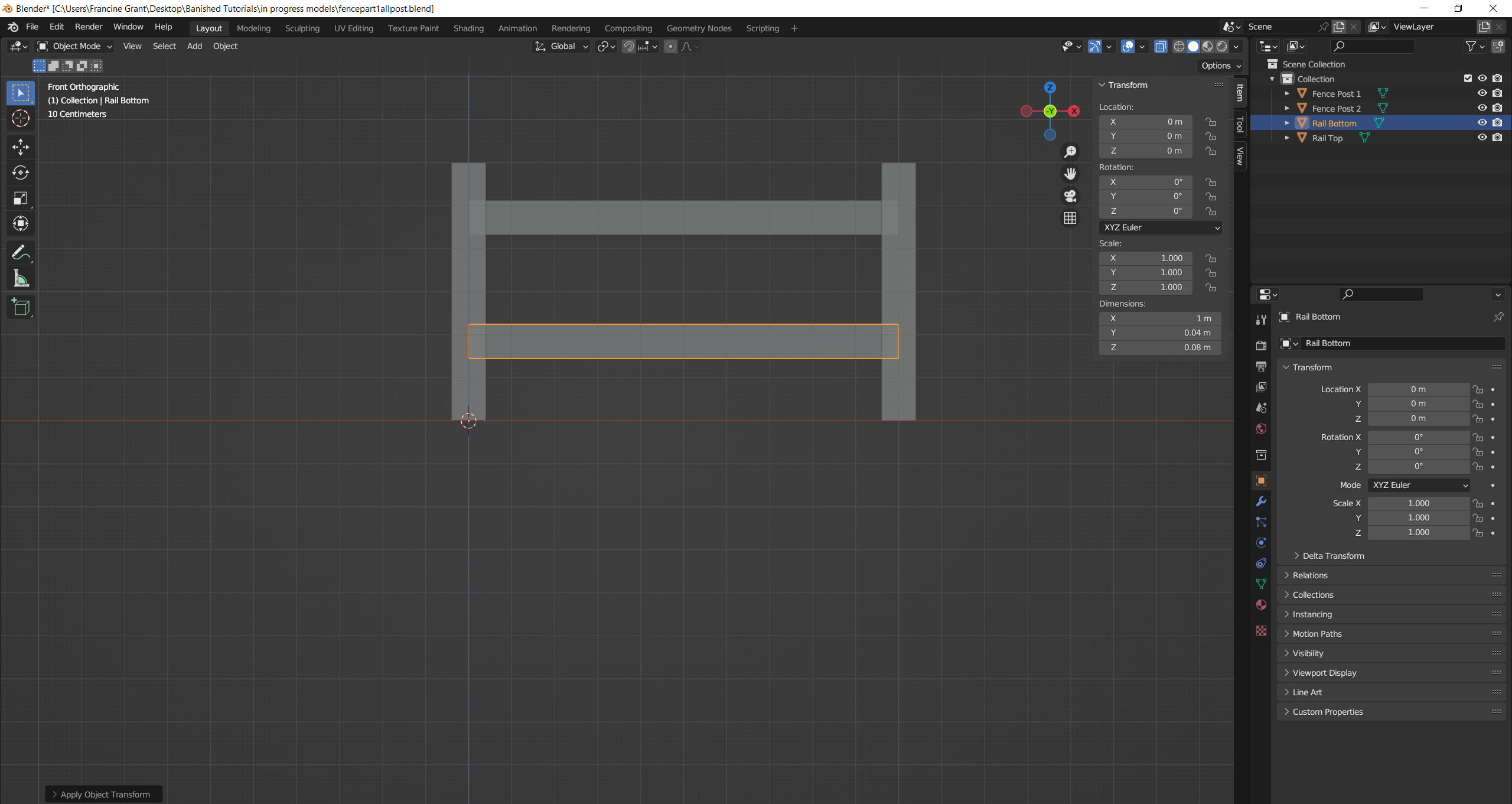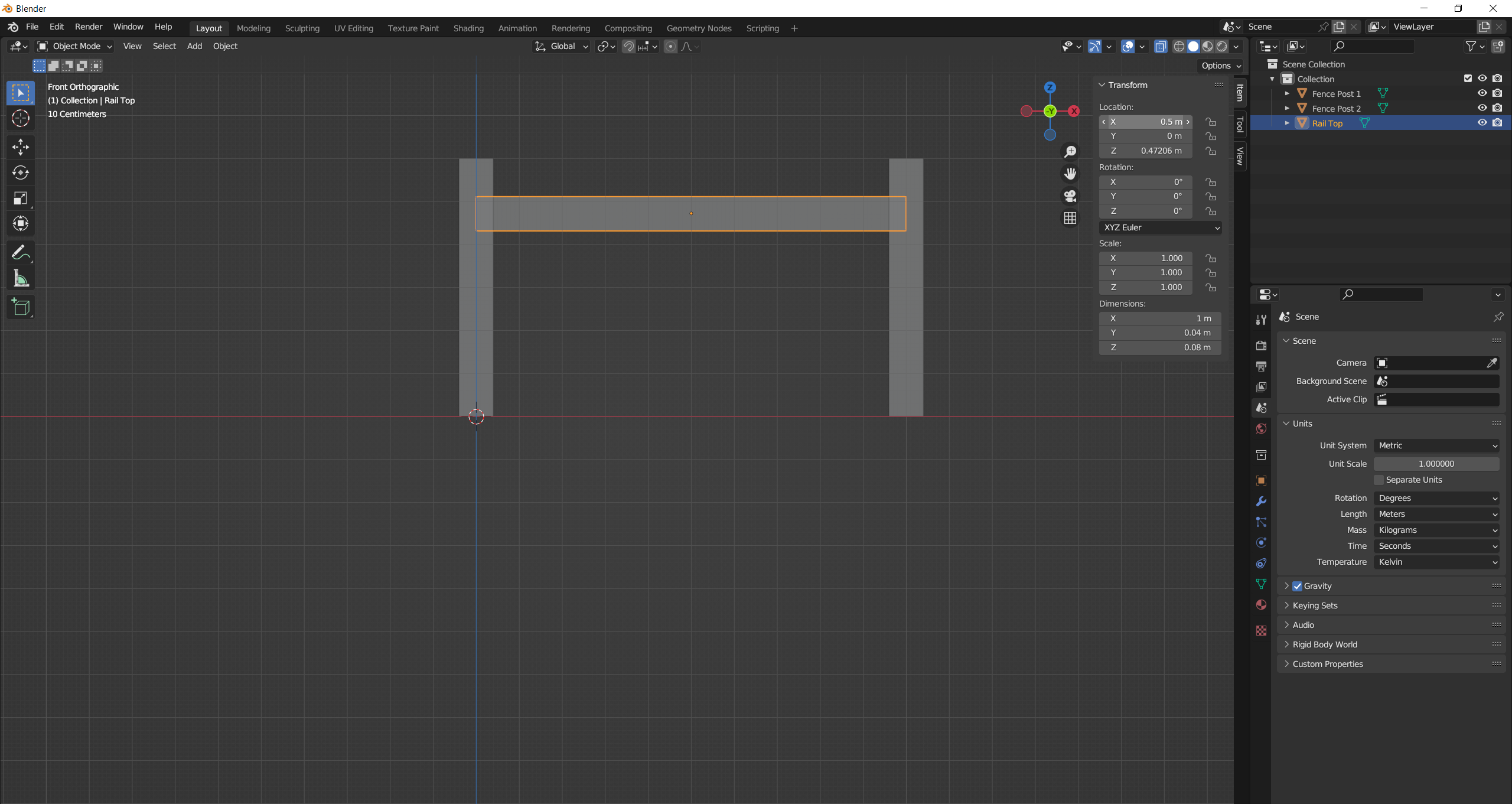18. APPLY the scale to your new railing: CONTROL + A > Scale. The scale should now reset itself to 1, 1, 1.  Now we need to move the rail into place. Tap "G" to activate the GRAB tool which will "load" the rail onto your cursor, then tap X to lock it on the X axis. Click to roughly place it in the center of your two posts (we made our rail wider than it needs to be so we don't have to be precise.)