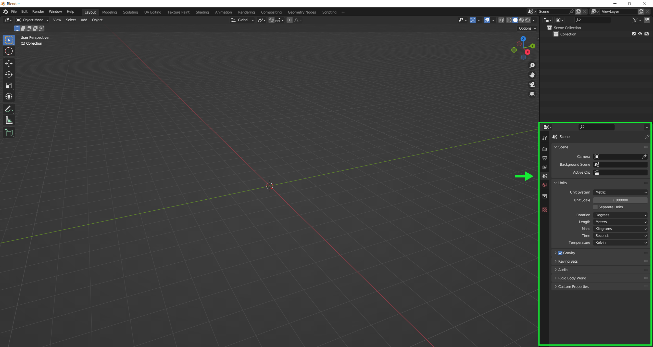 .04 From the PROPERTIES MENU on the bottom right, select the SCENE PROPERTIES tab, and toggle the UNITS section. Change the UNIT SYSTEM to METRIC, and the UNIT SCALE to 1.000000. A square on the grid in Blender will now equal 1 meter squared and 1 game tile square in Banished.