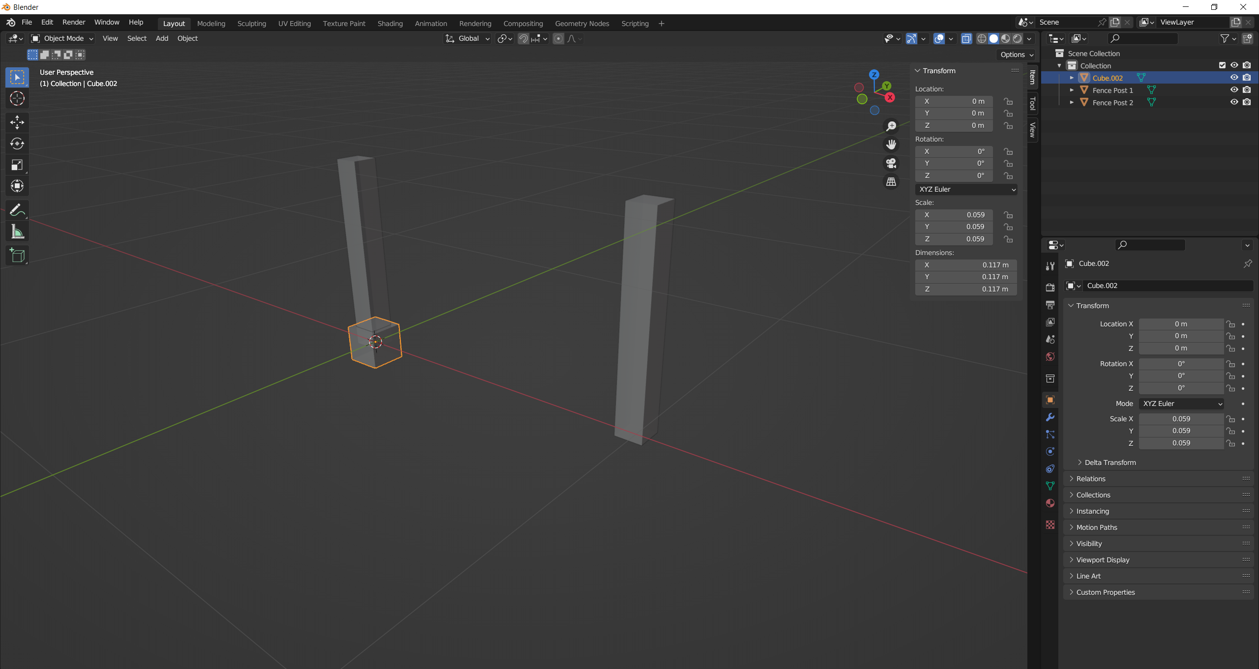 .13 We need to make a copy of our fence post, but instead of just making a copy, let's make it a LINKED COPY so any changes we make to one fence post will also be applied to the other. Tap ALT + D and see that your cursor now has a copy of the fence post loaded. We want to place it on the X axis, so tap "X" while it is loaded to constrain the placement along the X axis. When you "click" you will place your fence (don't worry about being precise, we will fix this in the next steps). You should now see in your OUTLINER section (top right) a Collection with 2 Cubes.