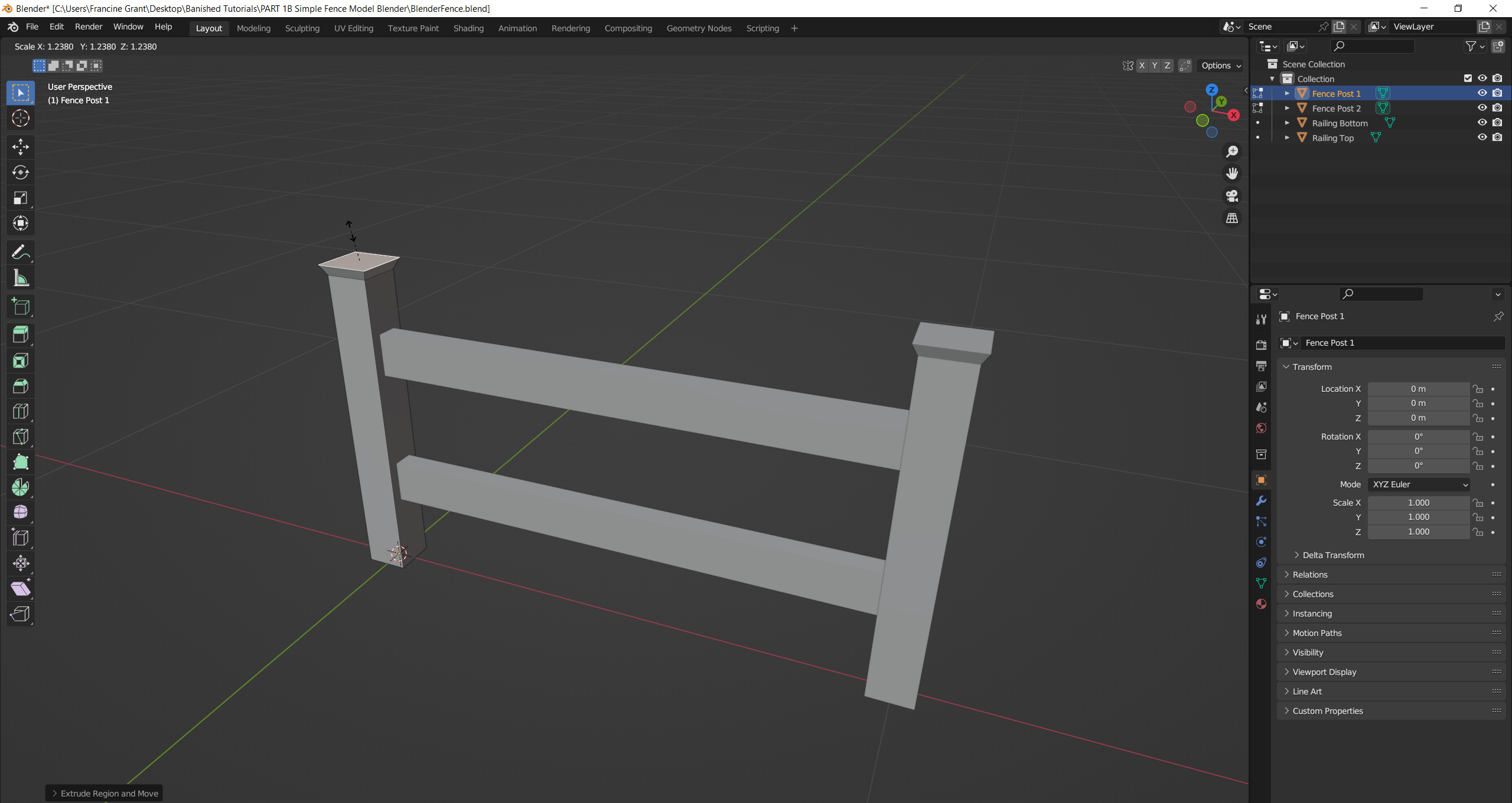 .12 To get Blender to recognize that our fence post is in its' original state, we need to select it and then APPLY THE SCALE by pressing CONTROL + A > SCALE. The SCALE in the TRANSFORM settings should now be reset to 1, 1, 1.