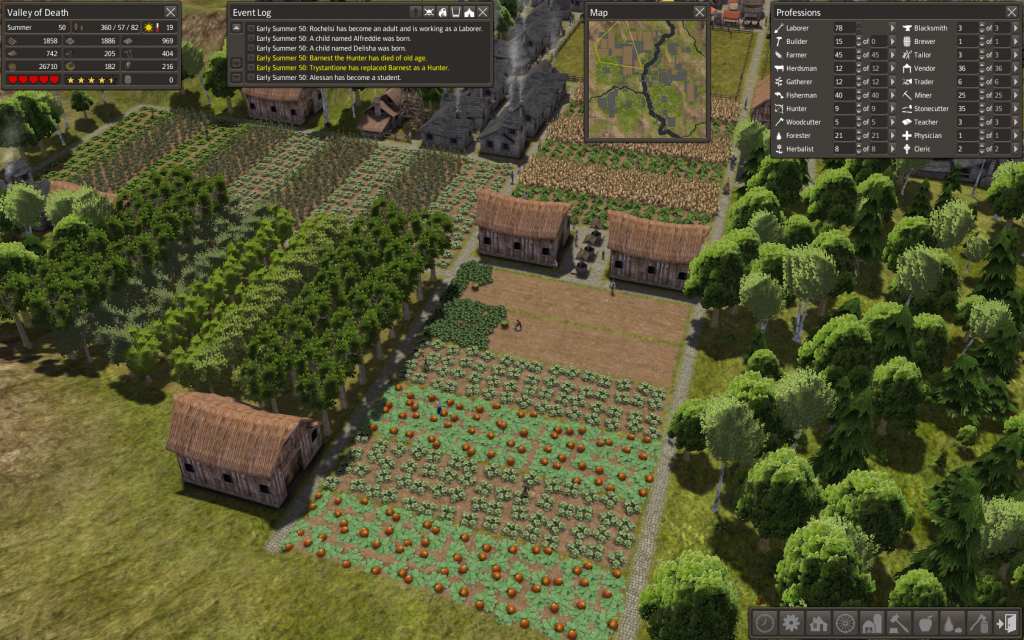 Things were hard for the first 3 years. I had a gathers hut with 4 workers and that was pretty much it. I lost a few people in those years. I rotated one worker out every now and then to make firewood then it was back to gathering. As the population grew I tossed in a hunters camp and fishermans dock, then loggers camp and my health was damn low so a herbalist was next.