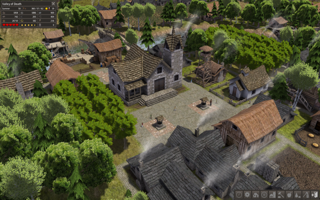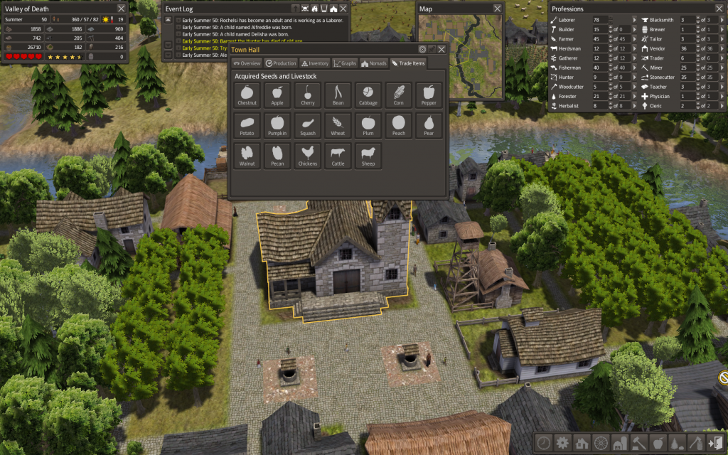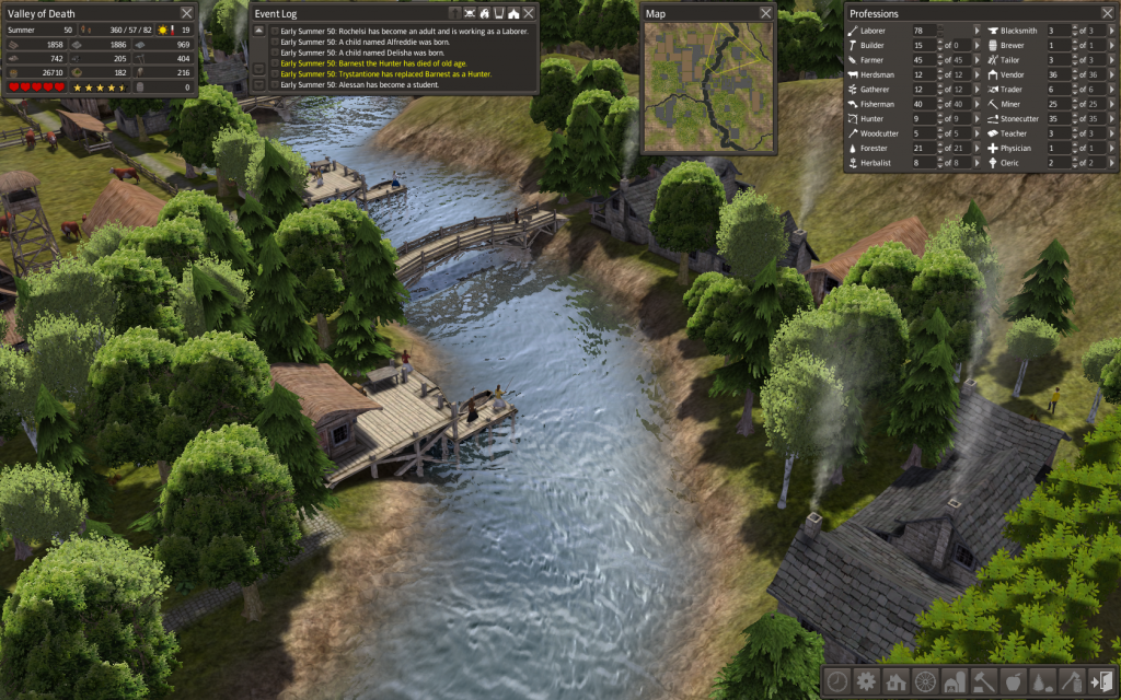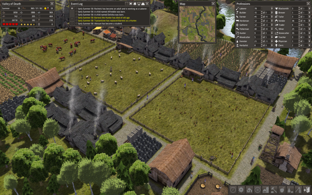 So, here's my take on the Valley of Death. It's Early Autumn of Year 37. The first two are my town hall summary and the mini-map for information purposes. Next up are the East side of the river which contains the start location and the oldest parts of the settlement. The initial forest village is to the South. This has become the industrial part of the valley with quarry and mine plus housing for the workers. It is a bit more gritty, with log cabins. The only efforts at beautification are the well and wagon memorial along the South side of the market square.
