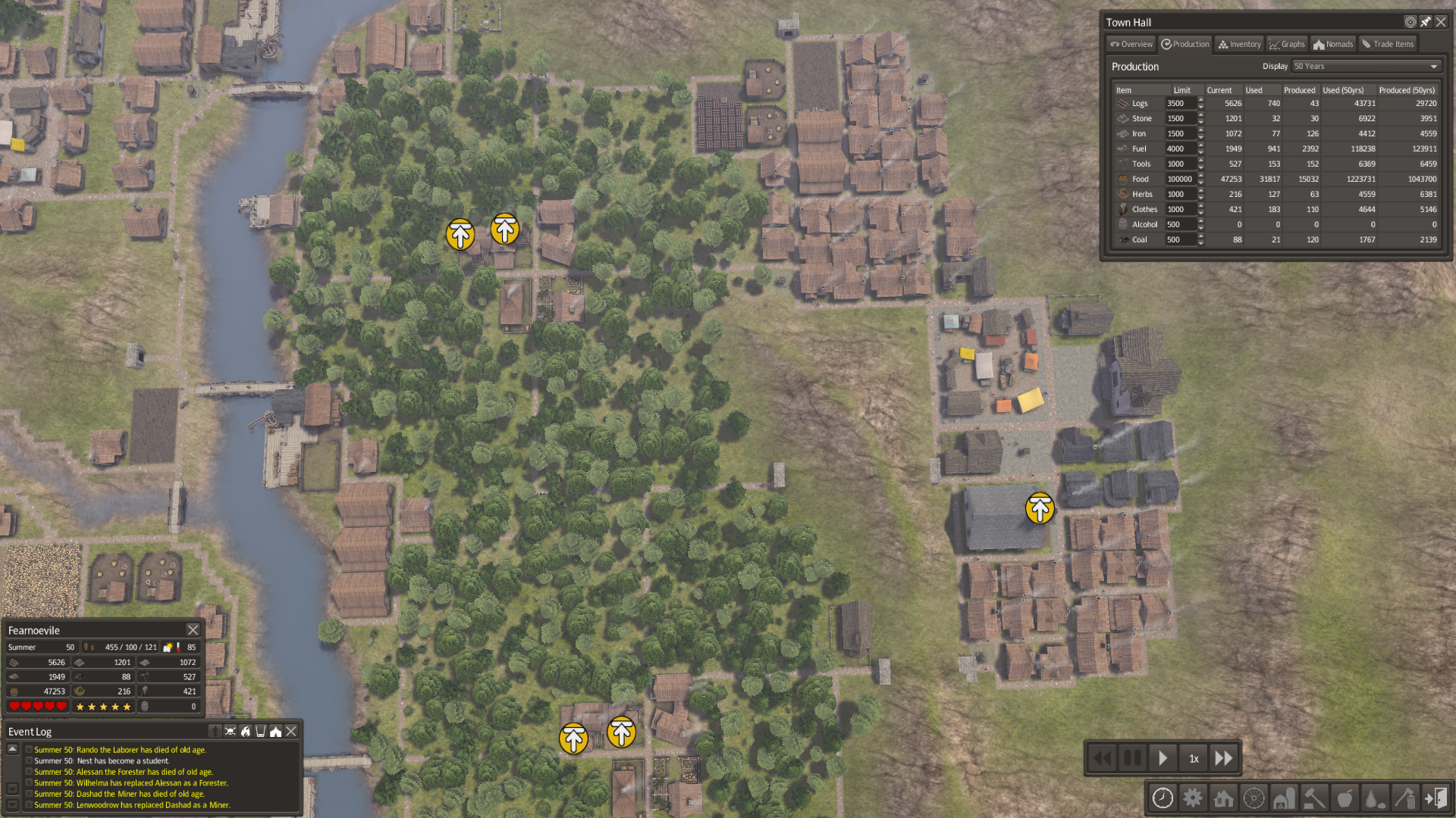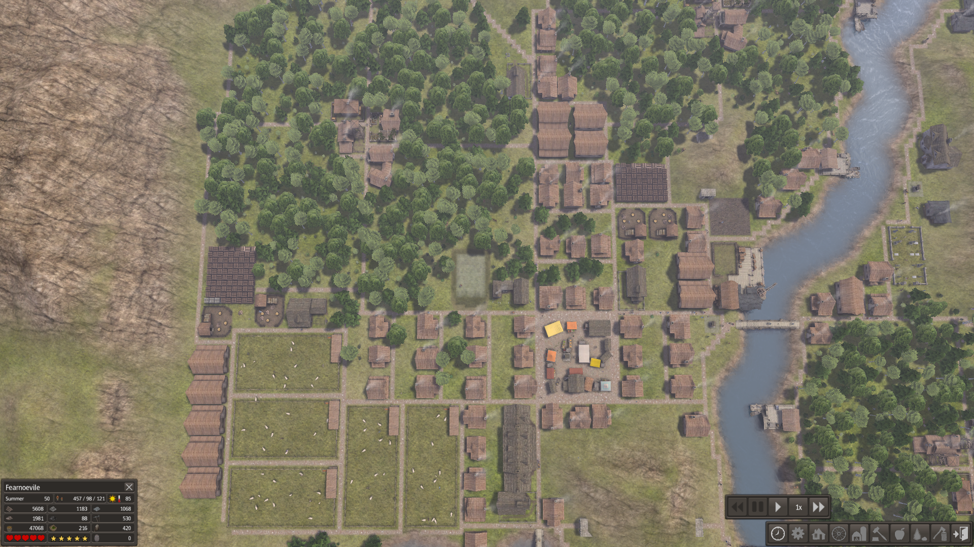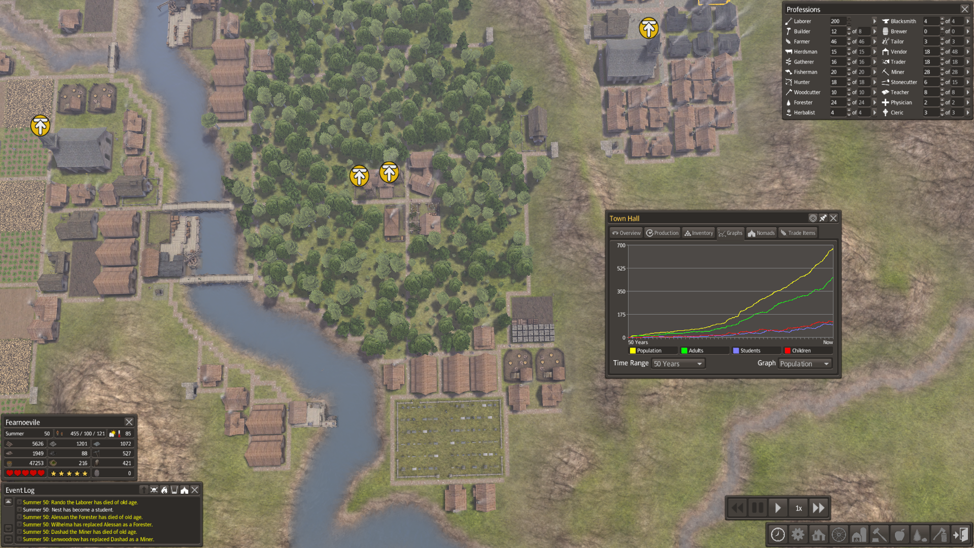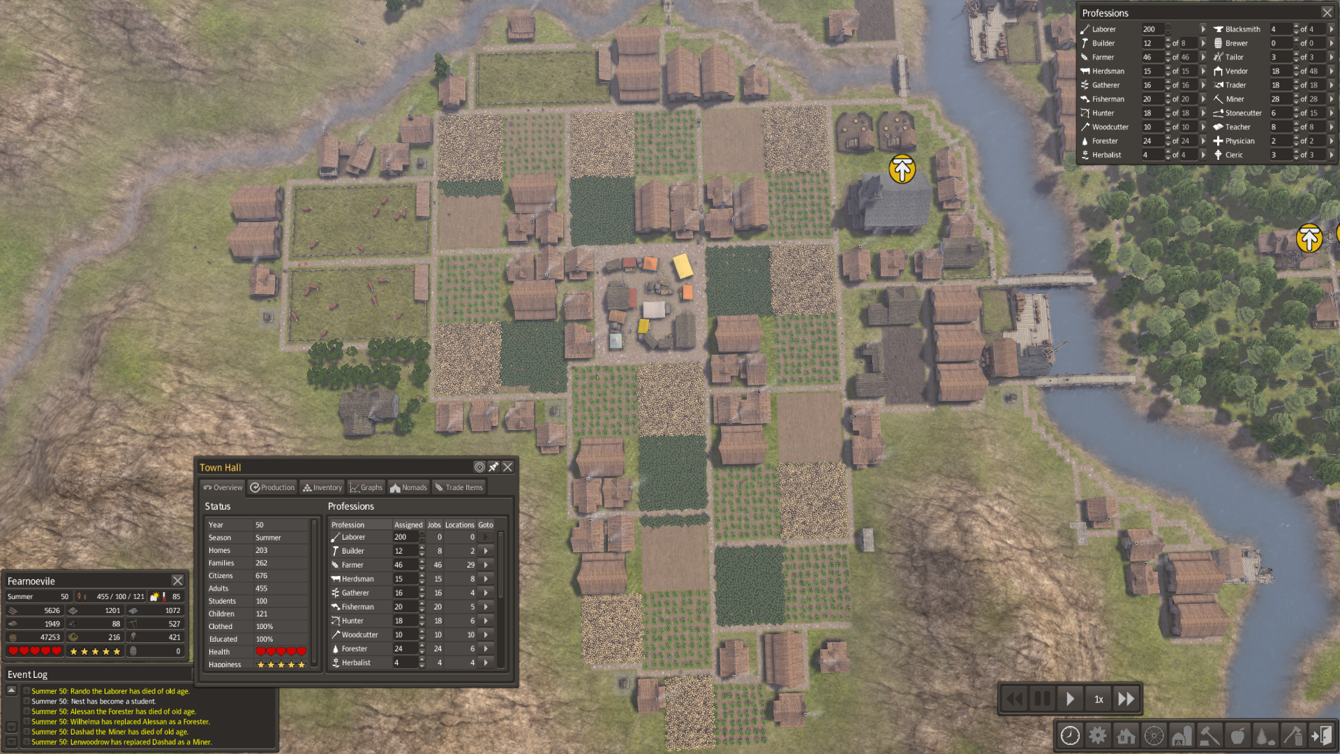 And to add links to starting pictures of game and overhead views of the town. The SW Farmlands can be seen in the Screenshot below showing the town stats, and the SE area can be seen in the population graph screenshot so I did not upload them again.