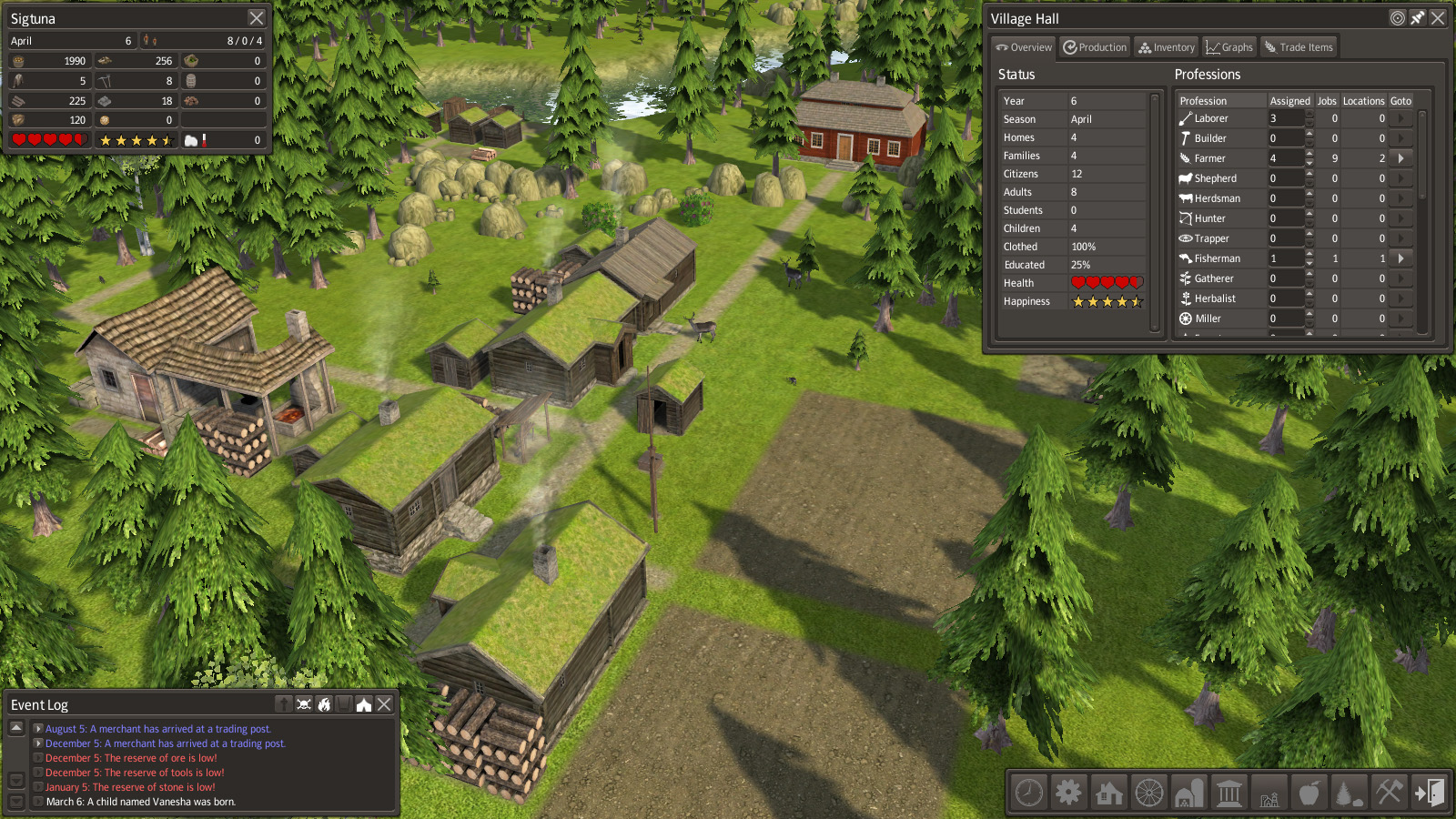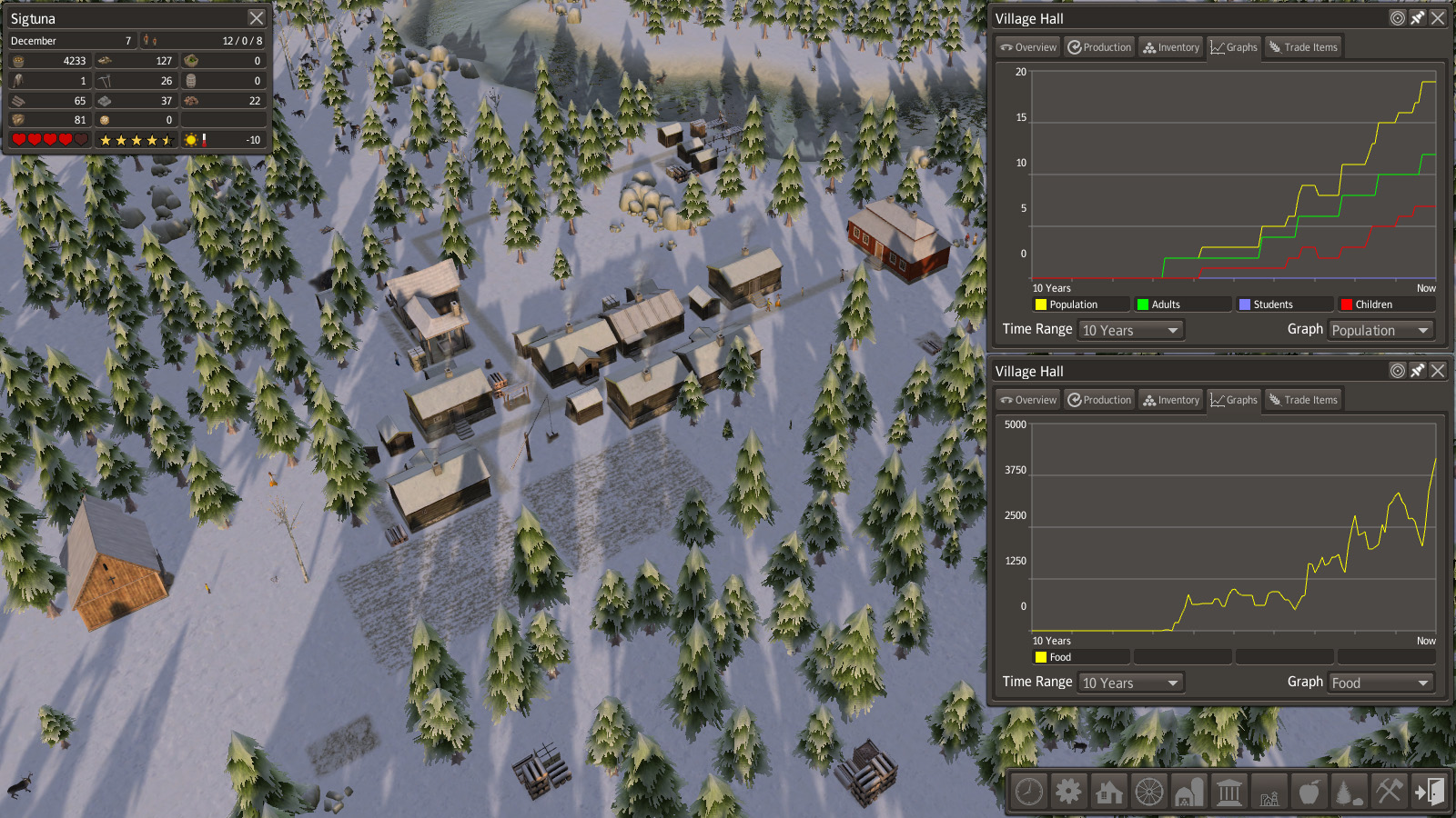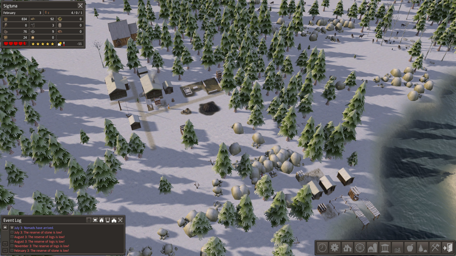 I got a new couple every year and with now 12 workers things go much faster. I still micromanage almost all jobs. My fisherman at the trading dock is the only full time worker. In April I send farmers to the fields, in summer I send all other guys to the forest for berries and mushrooms. In the harvest season I increase the amount of farmers if they have problems there and in winter they are in the forest again to gather firewood. It is already not enough fuel for my 6 houses and so a woodcutter has to works sometimes. The same with blacksmithing and charcoal burning. Hunting season is only if a herd of reindeer is crossing my settlement or if some newcomers need parkas. So it is much to do the whole year and doesn't become boring.