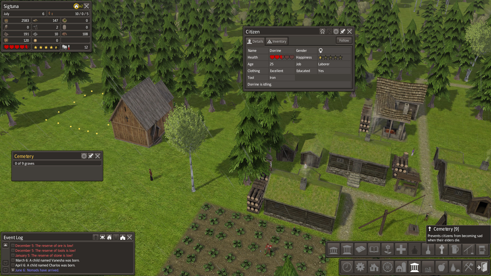 In Summer of year 5 I was going on a mushroom foray and happened to see a lone girl traveling in a valley. Probably she was banished from another village. I hope she will find the way to my settlement. Another couple of nomads arrived this summer and now I have a team of 8 workers and 3 children. Nice! :)