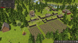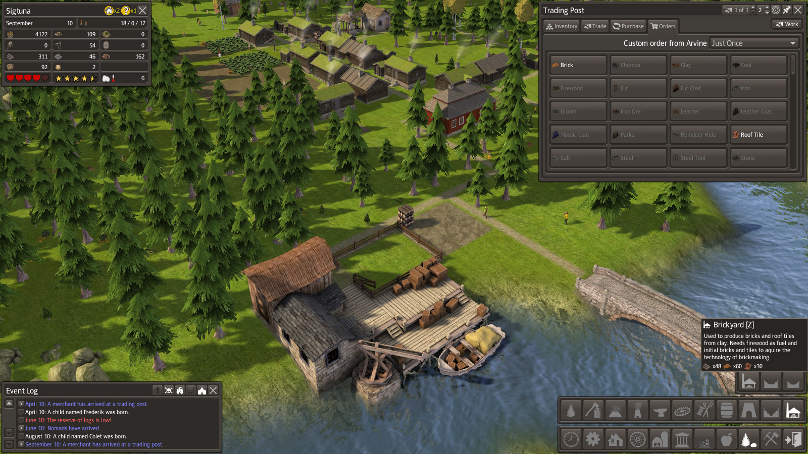 Back to business I sent my workers on a raid to the other side of the river. You remember, I already built a bridge there. A lot of resources were to gather and my bannies could not get enough. I also decided to build a proper trading post to attract more merchants. I finally want seeds and livestock as well as bricks and tiles to start my own production. I was not lucky with the resource merchants and so I gave an order to get the initial building materials soon.