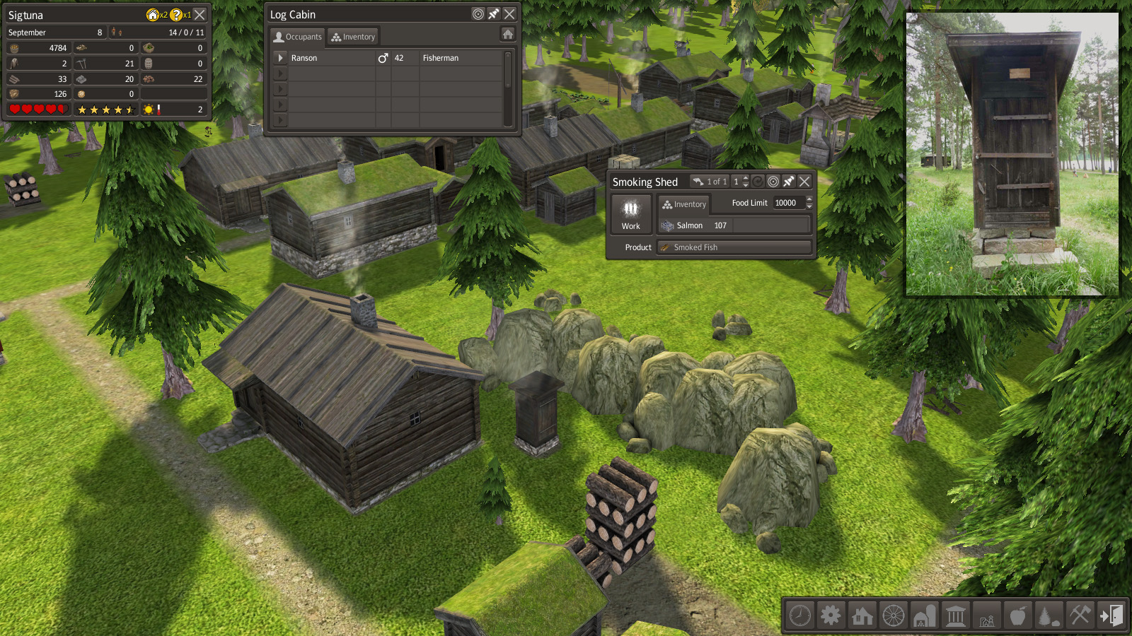 Another fire is now burning in a new item I made for my diligent people. It's a Rökkur and I found it in the Sagudden Friluftsmuseum. In this smoking shed you can preserve fish and Ranson the lone fisherman (yes, he had trouble with his wife) is now smoking. It turns fish into smoked fish with increasing food by 25% to simulate the advantage of preserving. You can try it in your own game with the SmokingShed.pkm.