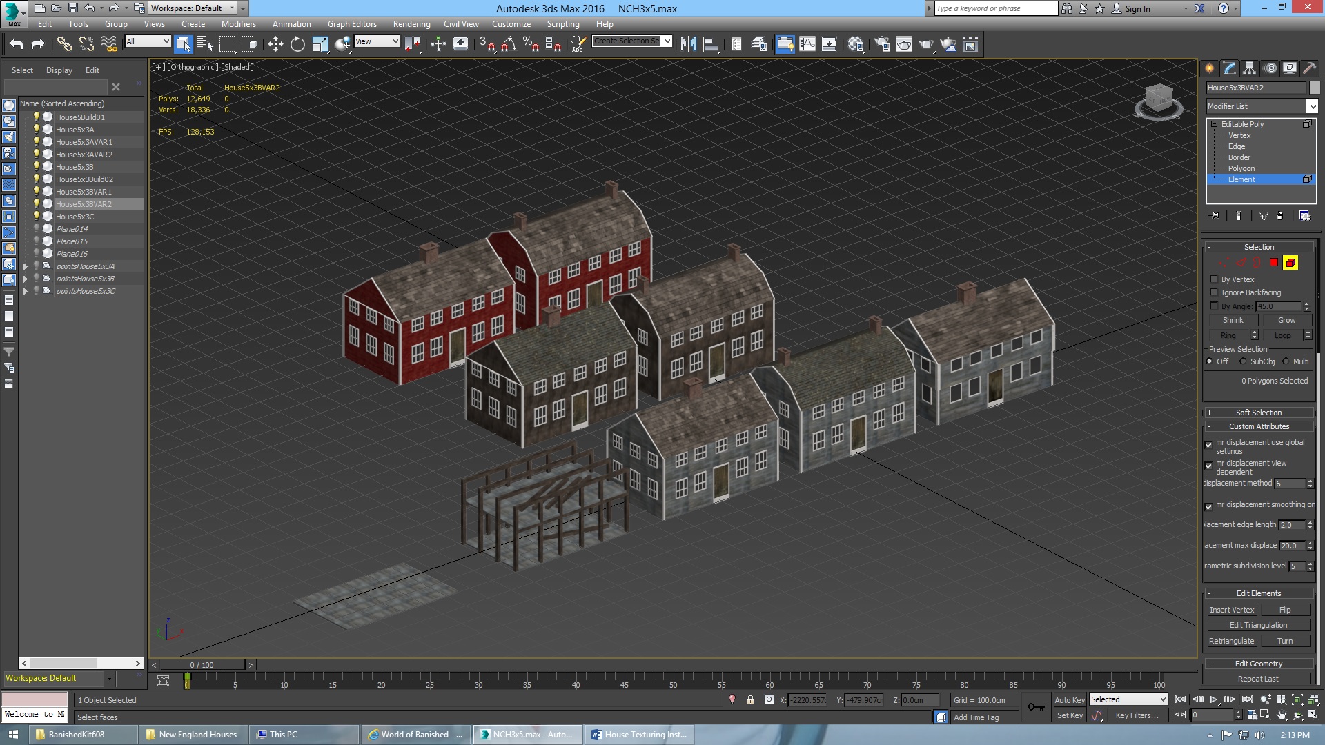 Each house is about 2000 poly's. This can be brought down by about 500 each house by getting rid of the double walls and make them planes instead.