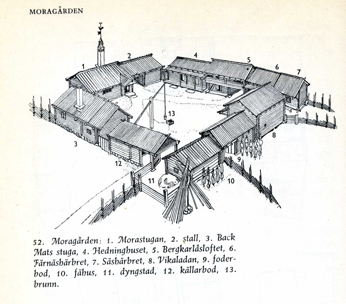 The squared off tun (yard) is typical of old farms from northern sweden. It places both the animal, storage and housing wall to wall, or near to eachother. Example of a Härbre in Norway.