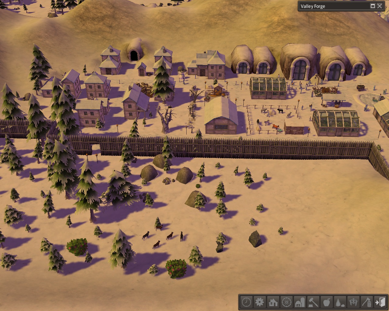 In spring of year 3, 12 adults with their 5 children came up from the underground settlement.  They immediately moved into the dwelling caves and were not overly concerned with having houses built.  Instead, they pitched in to gather downed branches for firewood and to help carry logs to the south edge of town where a palisade fence was being built to further protect the town from the wolves.  It was nice to have more laborers and builders.  It was also nice to have the extra security that the finished palisade fence provided.  The wolves kept their distance from the fence.  We could still hear the howling at night but slept well knowing we would not awake to find a wolf at our door.