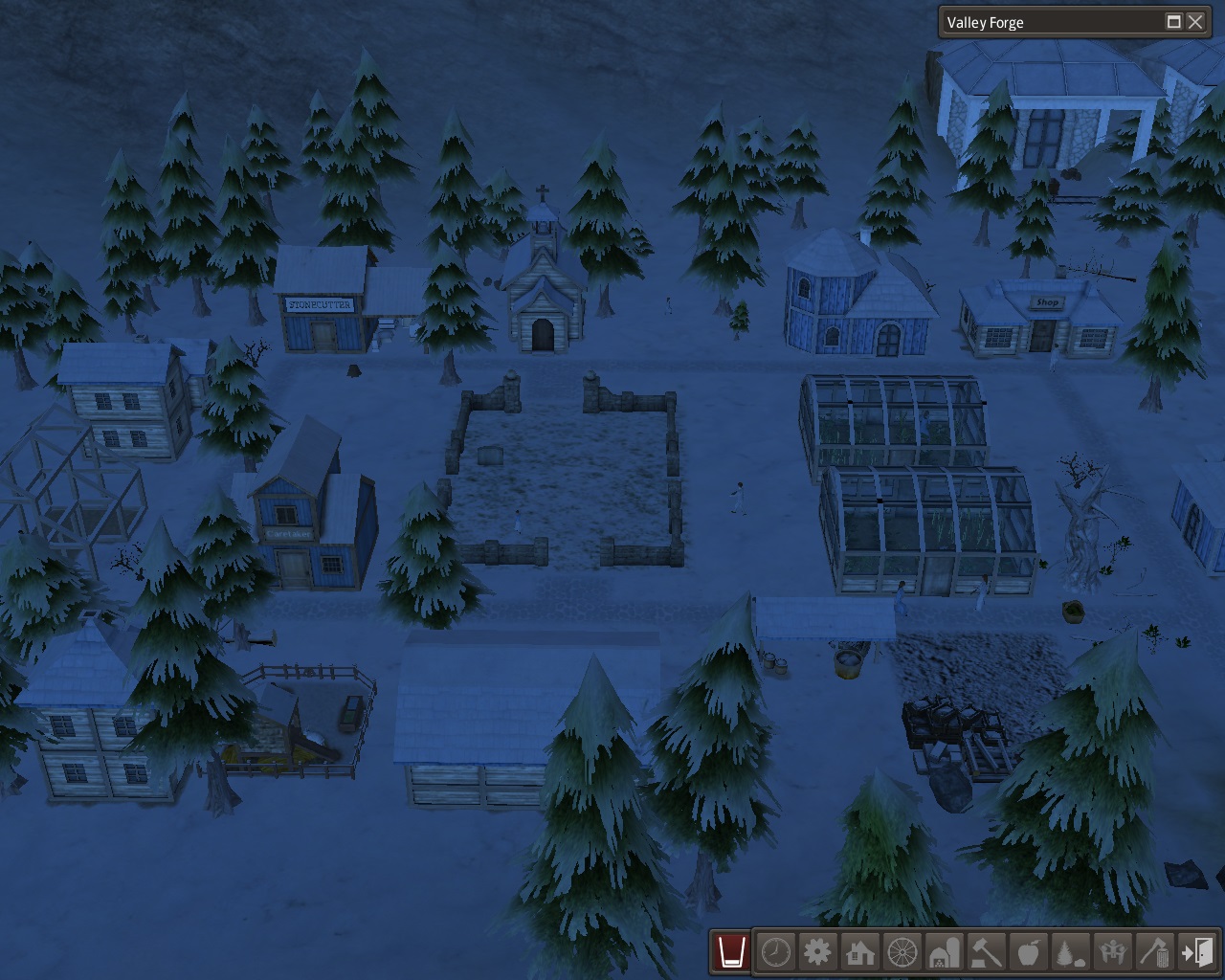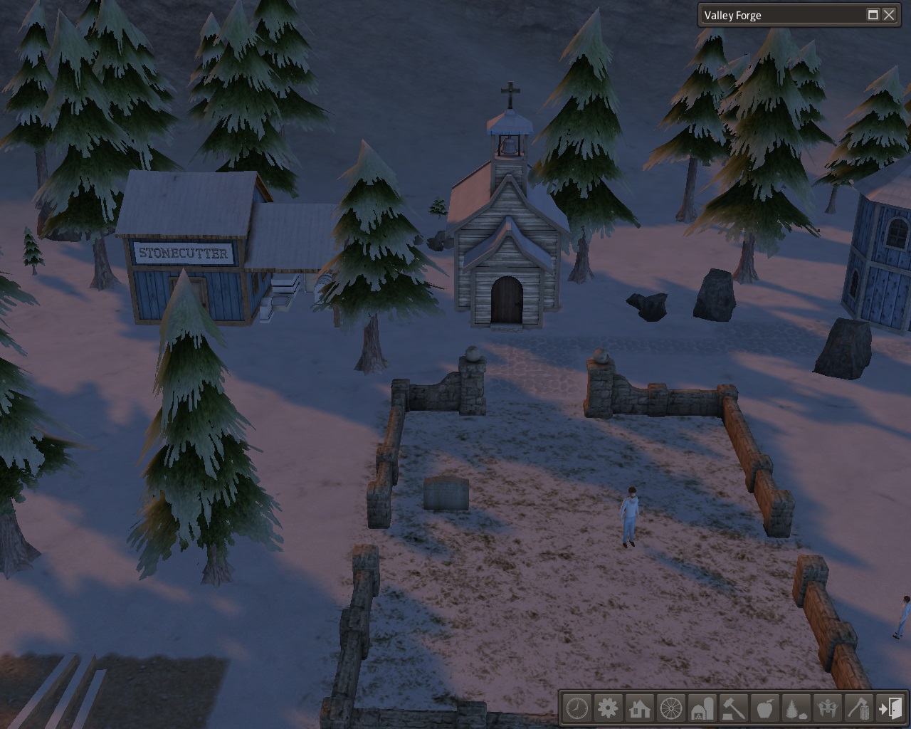By autumn a house had been built by the overseer's office, and the foundations were laid for another house, a forge forester, and the forge in the north valley.  Over by the tunnel, the shop and 2 houses had been built.  The cemetery area was walled in, and the chapel had just been started when one of the workers died in childbirth.  The stonecutter cut and carved the headstone while his house and workplace were being built.  There were still families in the cave dwellings that needed houses but we raised the building priority and by the end of the year, the Forge was completed and we were making tools.  No respectable dwarf would ever run out of tools.