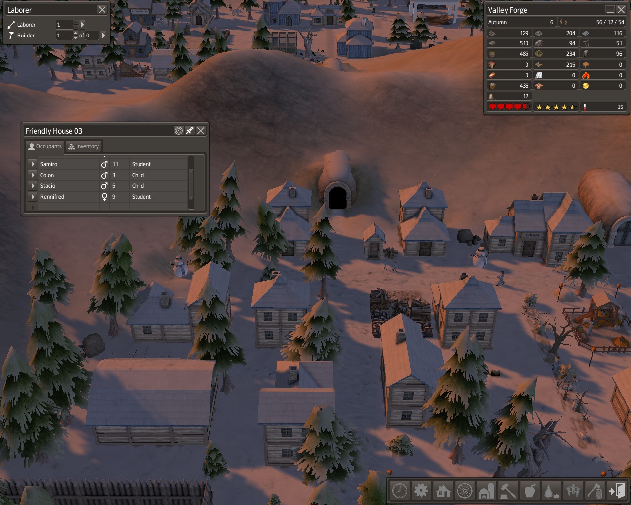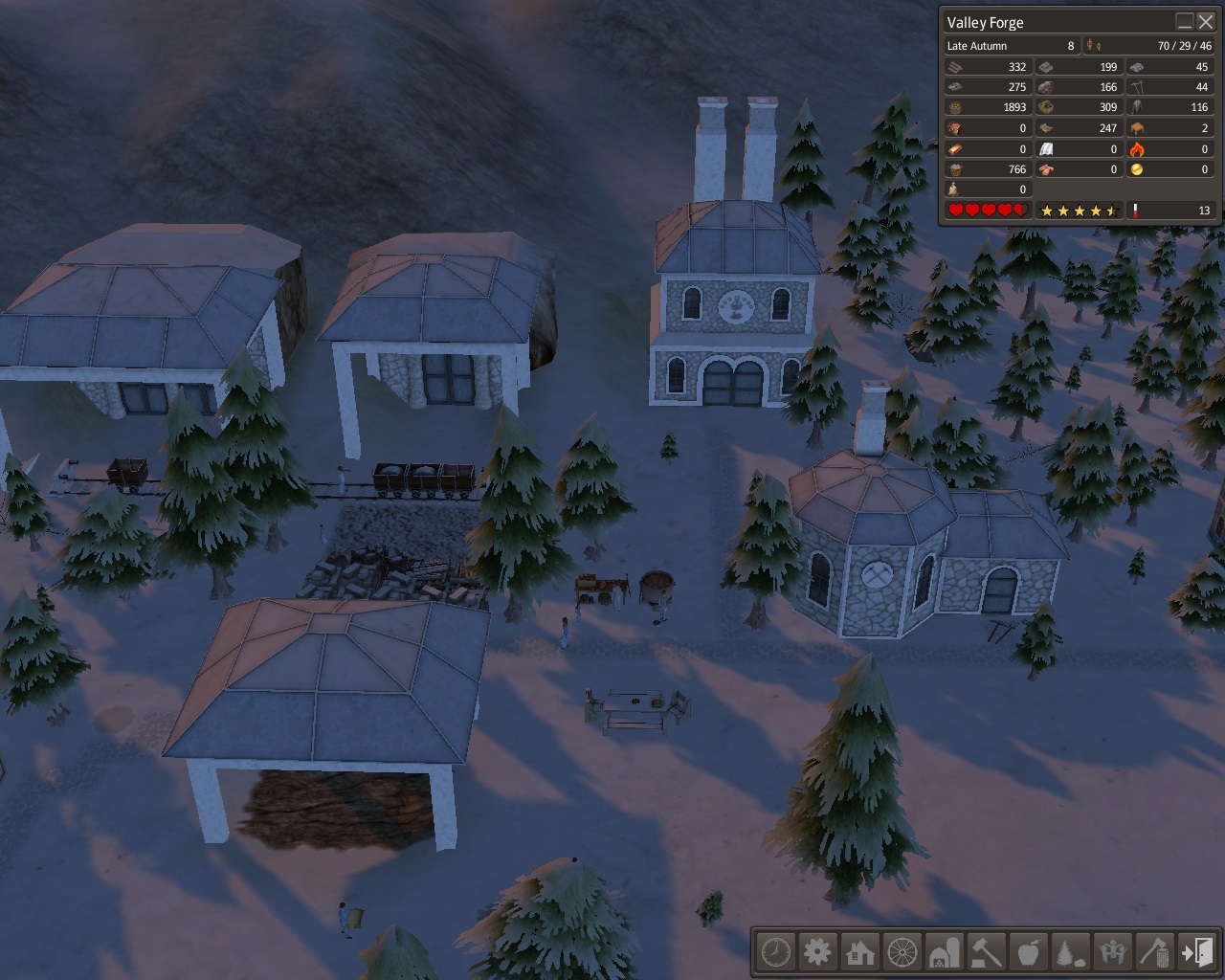 The stew was good on those cold winter days when temperatures drop into the teens and single digits.  We realized how far the school children had to walk out in the cold so we built a 2nd school behind the overseer's office.  Near the school we built a mill hoping to have a bakery making fresh warm bread to go with the stew but the barley we traded for in autumn never made it to the mill.  The apples, walnuts, and venison, that we traded wool and hide coats for, did not stay long in storage either.  Our food and log supplies were still very low.  Life was a lot easier down in the caves.