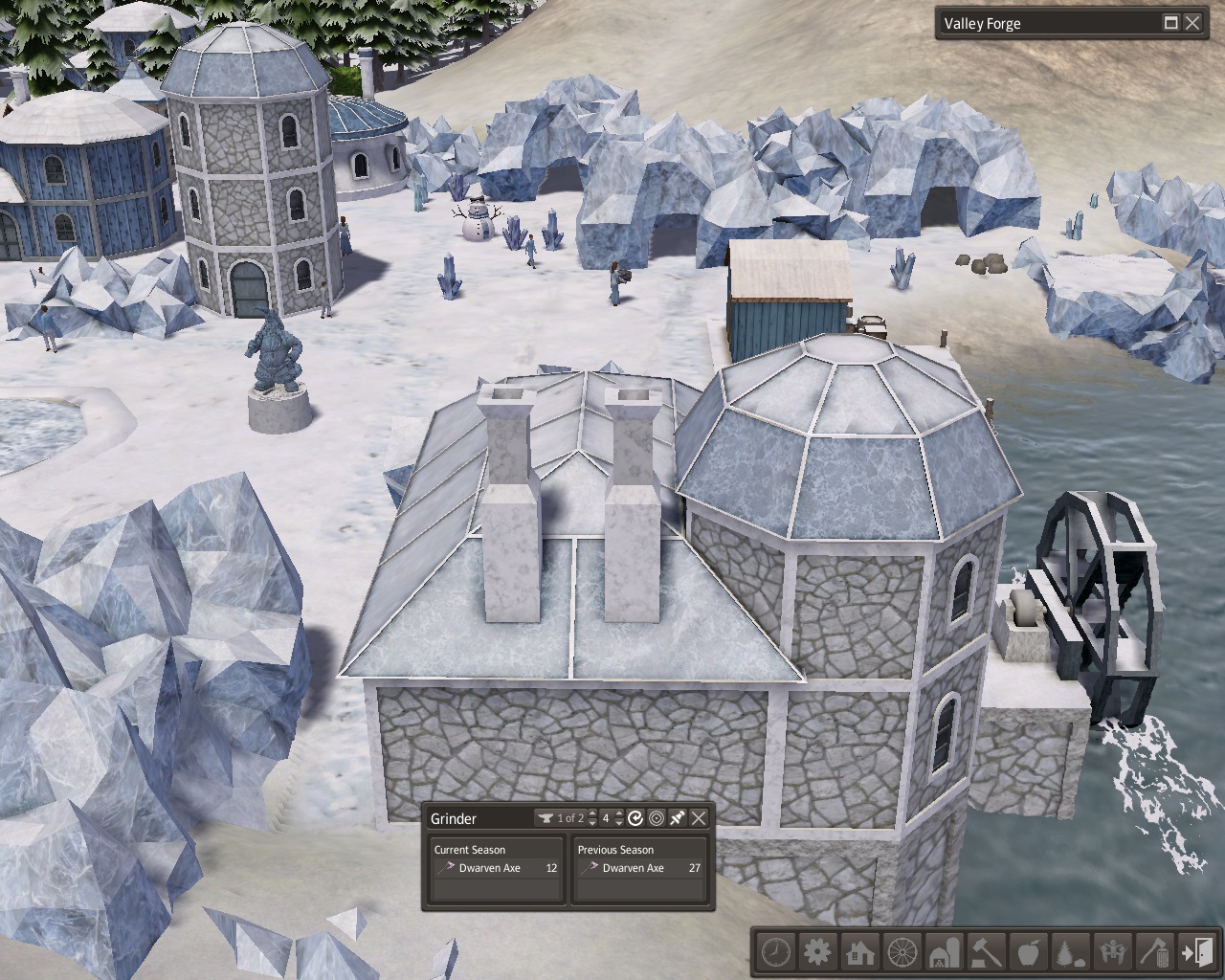 A third crystal statue was carved in the port area, like the second one this statue was a dwarf miner with his pickaxe.  That same statue was carved in front of the mines next to the quarry.  A worker was again digging stone out of the quarry.  The first statue was the dwarf with the lantern by the chapel.  Our mountain Valley Forge was prospering.