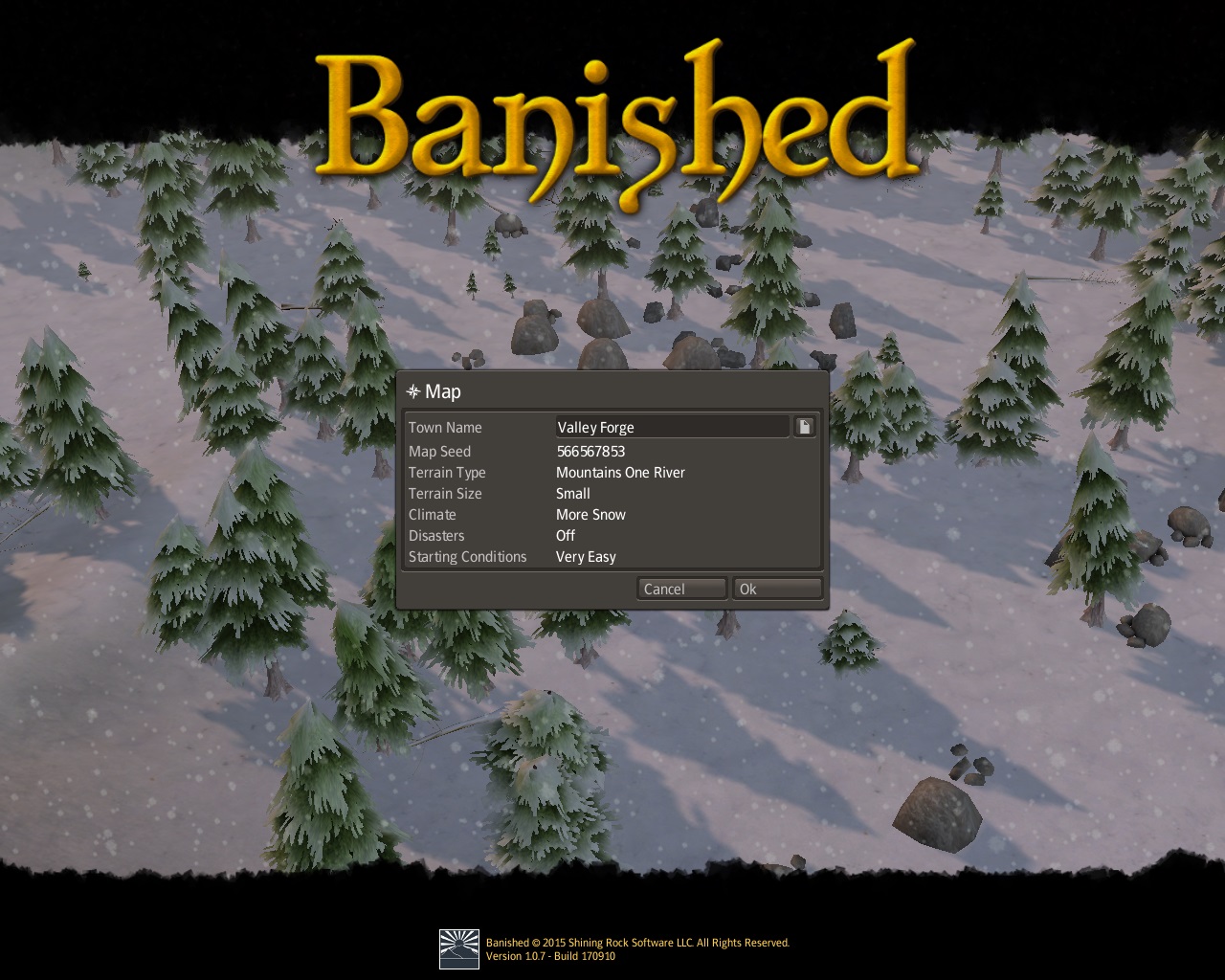 Map seed  #  566567853     Mountain One River,   Small,   Fair,  Disasters Off,   Very Easy 12 families