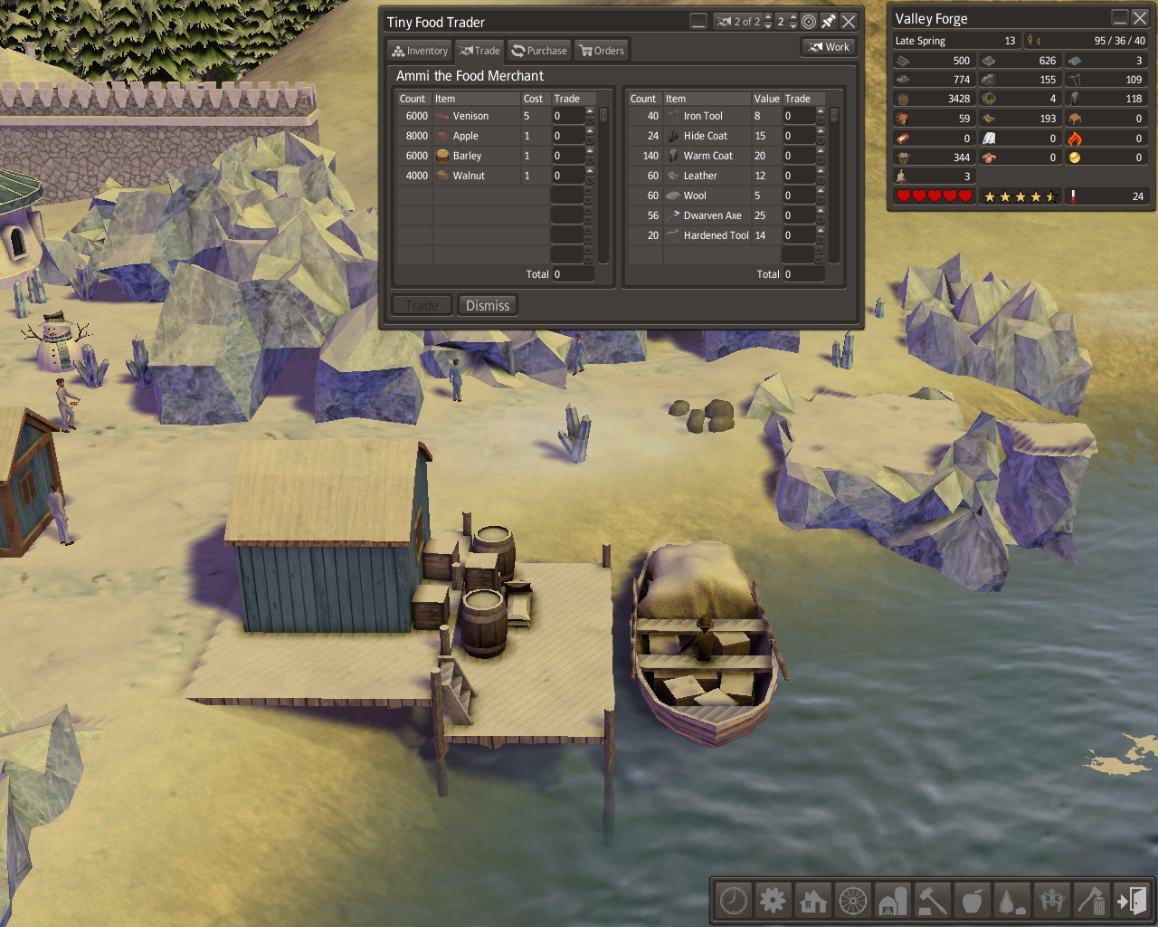The riverboat trader returned with our standard order of apples, barley, and walnuts but this time included venison that we traded for years before.  We would trade for some again now that we had a good supply of trade goods with good trade values stocked at the trading post.  Our food supply was the best it had ever been and we could trade for extra apples for the ale house.