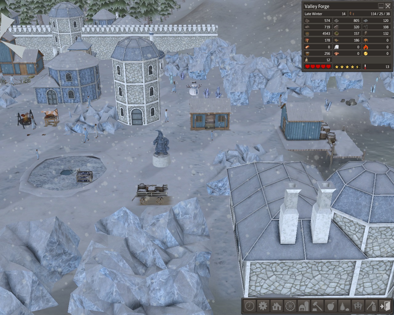 We had been so busy tending our food supply that we didn't notice the shortage of iron.  We were about to adjust the number of workers in the mines and smelter when an event occurred that did not happen often but we would take advantage of.  The riverboat trader did mention there seemed to be more ice blocks upriver that spring.   They reached us by summer and, as sometimes happens, they jammed together to block the river.  The blockage formed a makeshift bridge from one side of the river to the other.  We immediately sent laborers to the other side to quickly gather what surface iron there was to be had.  The blocks were showing some signs of separating by the time the workers returned, they made it back just in time.  Some were given the job of helping to clear the blockage and others were assigned to the mines and smelter.  Our iron supply improved and our supply of trade goods was soon restored.