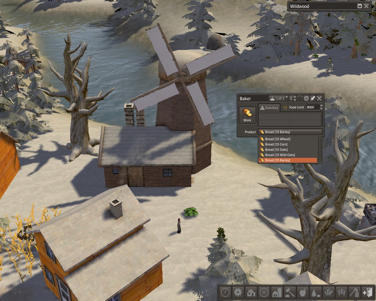I though fresh baked bread would go good with the soup and we had oats that could be ground into flour.  We began building a baker that would also mill the grain. We chose a windy spot by the river.  The foundation had just been laid when Hannon came to port.   We traded hide and wool coats, wool, and emerald necklaces for apples and barley.  Barley would go to our baker and our oats would continue to be fed to the sheep.  We were pleased with the trade value of 20 we got for the emerald necklaces.