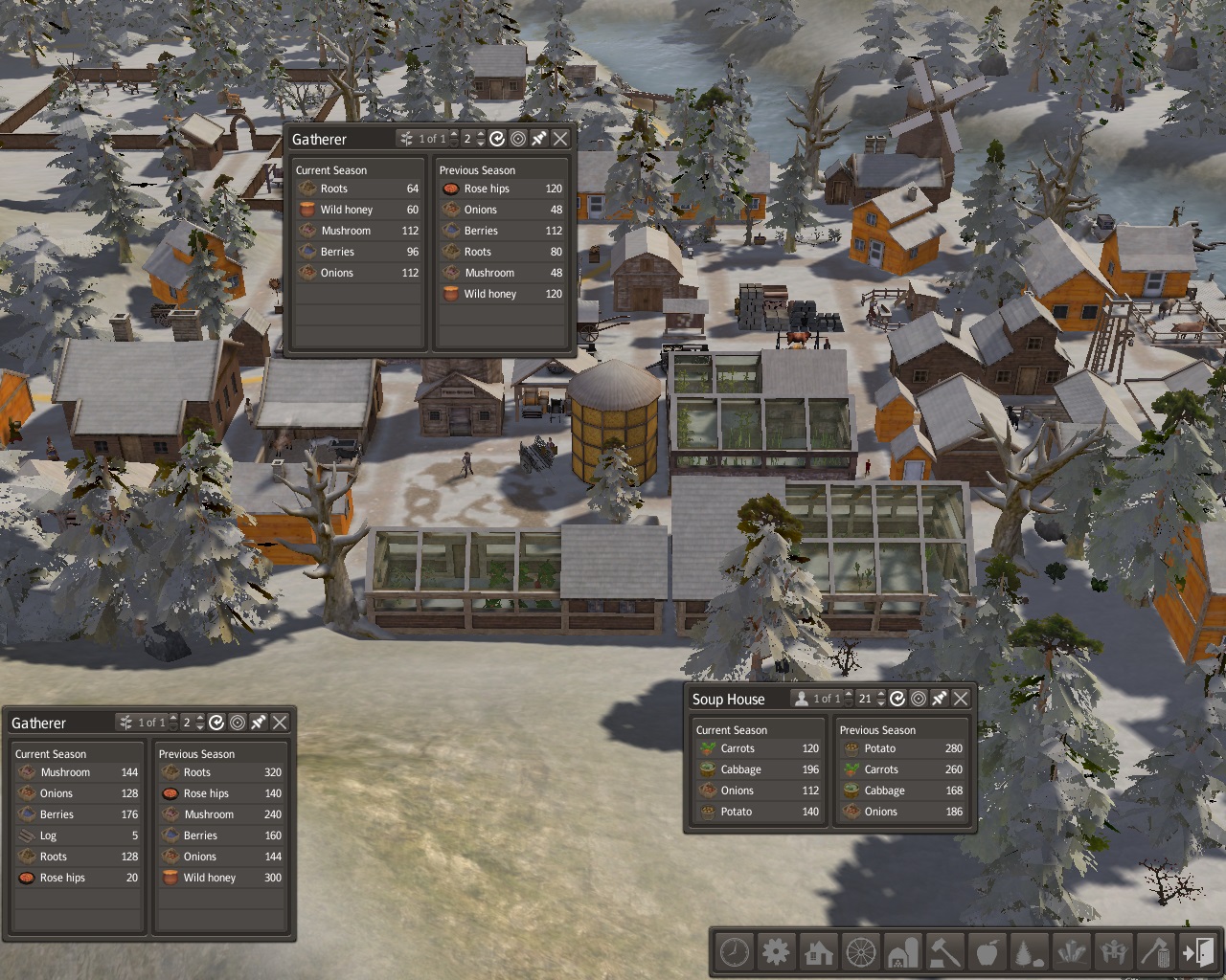 We would also have to rethink our food supply stability.  We had a few months without snow and there was some wild foods to be gathered.  We thought it was worth having a gatherer's shed and a permanent gatherer working near the miner's houses.  I would continue to gather wild foods and branches north of our house.  We also built a soup house behind the grain house.  We would grow potatoes, carrots, cabbage, and onions; good vegetables for making soup.