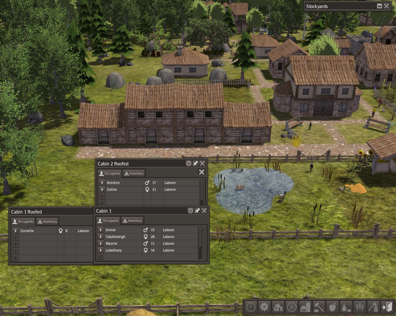In spring, 2 couples with 3 adult children came from Riverboat Junction.  Three old town worker cabins were built for them next to the other 3 by the town hall, across from the duck pasture.  The newcomers liked the view of the duck pond but wanted to know why there was a little piglet in the pond.  That convinced us that the pigs needed more room.  One of the little piglets squeezed through the pasture fences and was in the pond with the ducks.