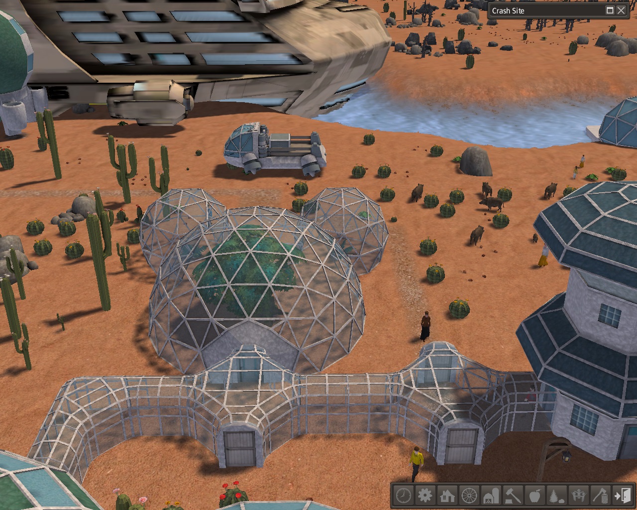 Earlier that year, a market dome was built near the school.  It would be used like a storage unit until we had a spare worker.  We only had 12 workers at the time: 2 laborers, 1 builder, 1 mudd worker, 1 smith, 1 tailor, 1 forester, 1 woodcutter, 2 hunters, 1 fisherman, and 1 herbalist.  The second hunter was working west of the dome where there were 3 herds of boars.  There was an area there with a lot of cacti growing and a lot of cactus fruit to be gathered.  The dome would be the closest storage for those workers to use.
