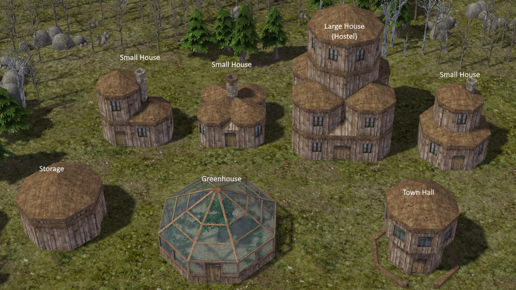 Went and took a look at the "forge" and it's already got blacksmith/mining stuff, so think the building with chimney could be a bakery or some kind of cooking establishment,  the large building maybe an inn and if you think of those little building as just being the surface to underground houses   :)